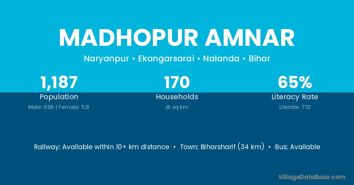 Biharsharif (34 km) is the nearest town to Madhopur Amnar village for major economic activities and is located approximately 34 km away.