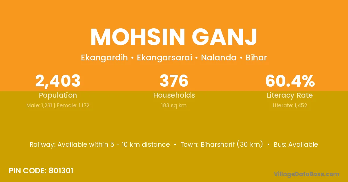 Biharsharif (30 km) is the nearest town to Mohsin Ganj village for major economic activities and is located approximately 30 km away.
