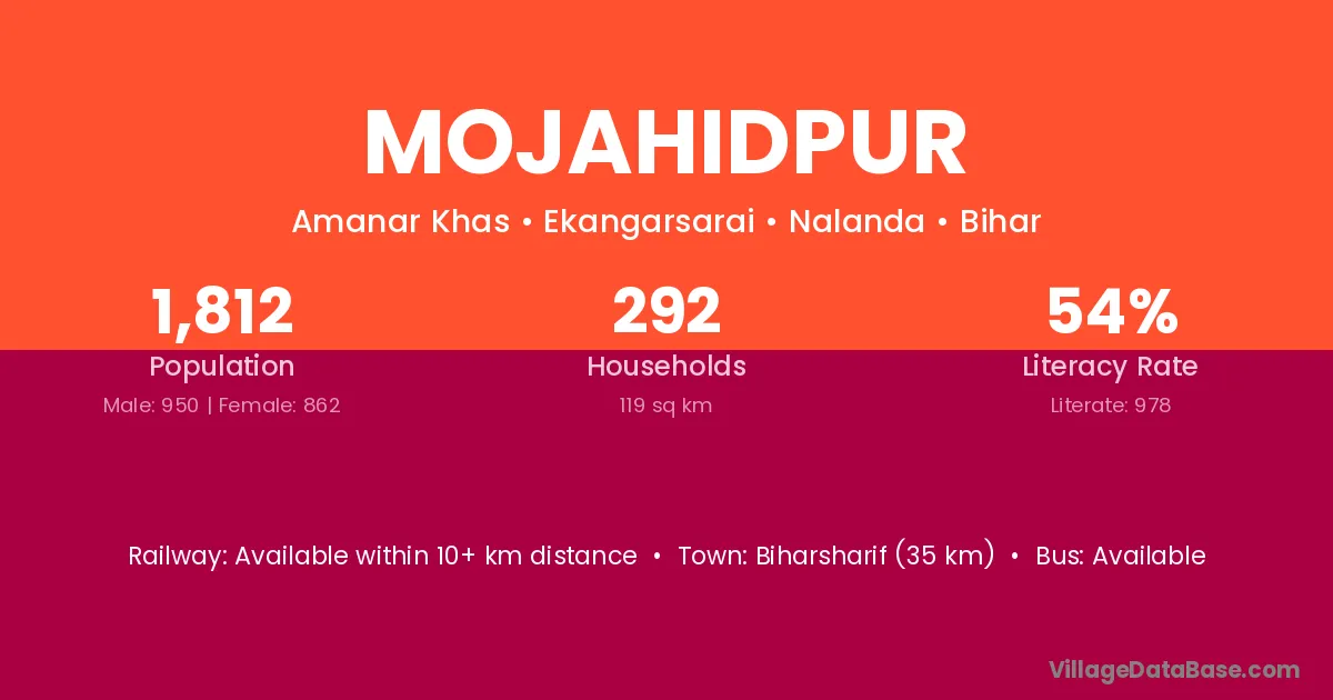 Biharsharif (35 km) is the nearest town to Mojahidpur village for major economic activities and is located approximately 35 km away.