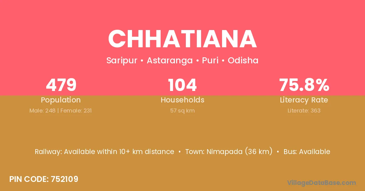 The literacy rate of Chhatiana village is 59.28%. Male literacy stands at 69.45% and female literacy at 48.79%.