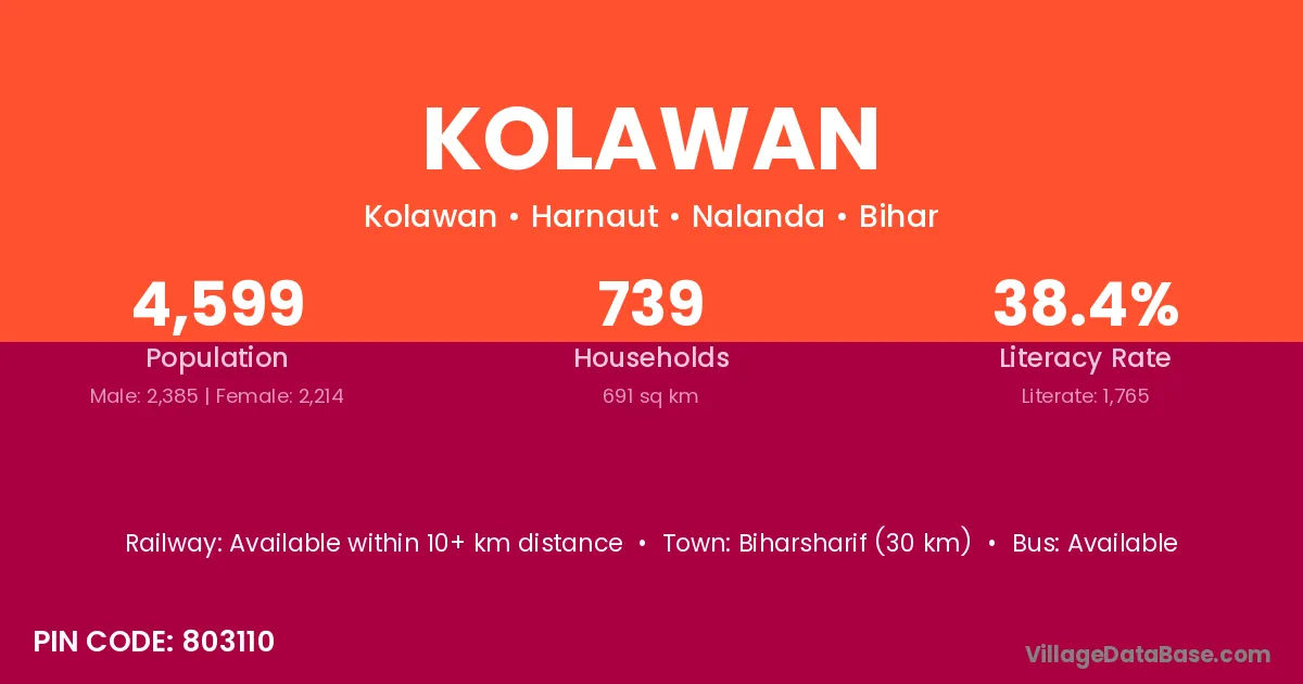 Biharsharif (30 km) is the nearest town to Kolawan village for major economic activities and is located approximately 30 km away.