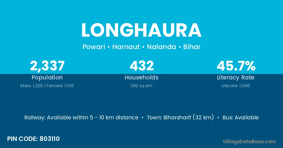 Biharsharif (32 km) is the nearest town to Longhaura village for major economic activities and is located approximately 32 km away.