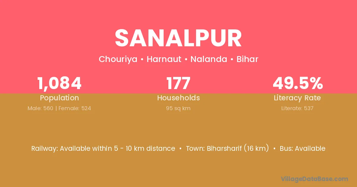 Biharsharif (16 km) is the nearest town to Sanalpur village for major economic activities and is located approximately 16 km away.