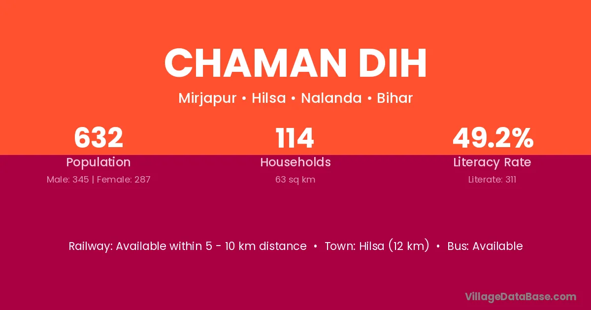 Hilsa (12 km) is the nearest town to Chaman Dih village for major economic activities and is located approximately 12 km away.