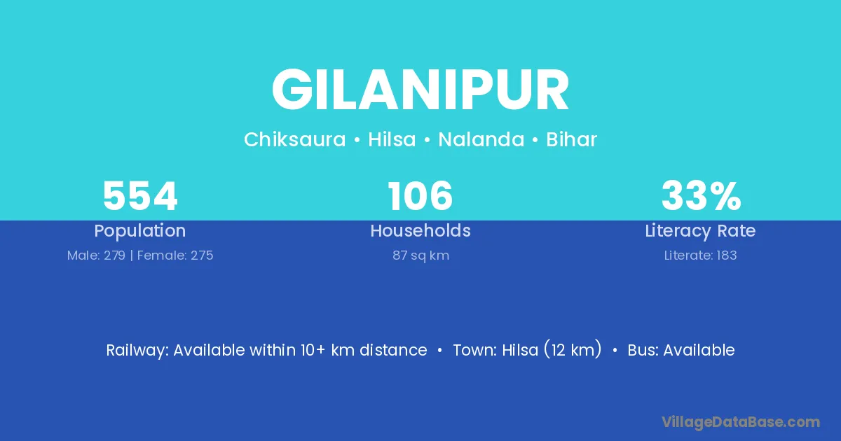 Hilsa (12 km) is the nearest town to Gilanipur village for major economic activities and is located approximately 12 km away.