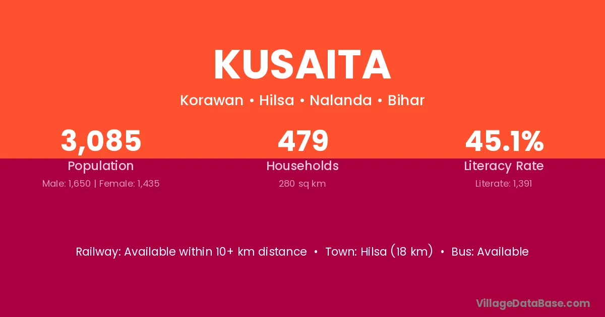 Hilsa (18 km) is the nearest town to Kusaita village for major economic activities and is located approximately 18 km away.