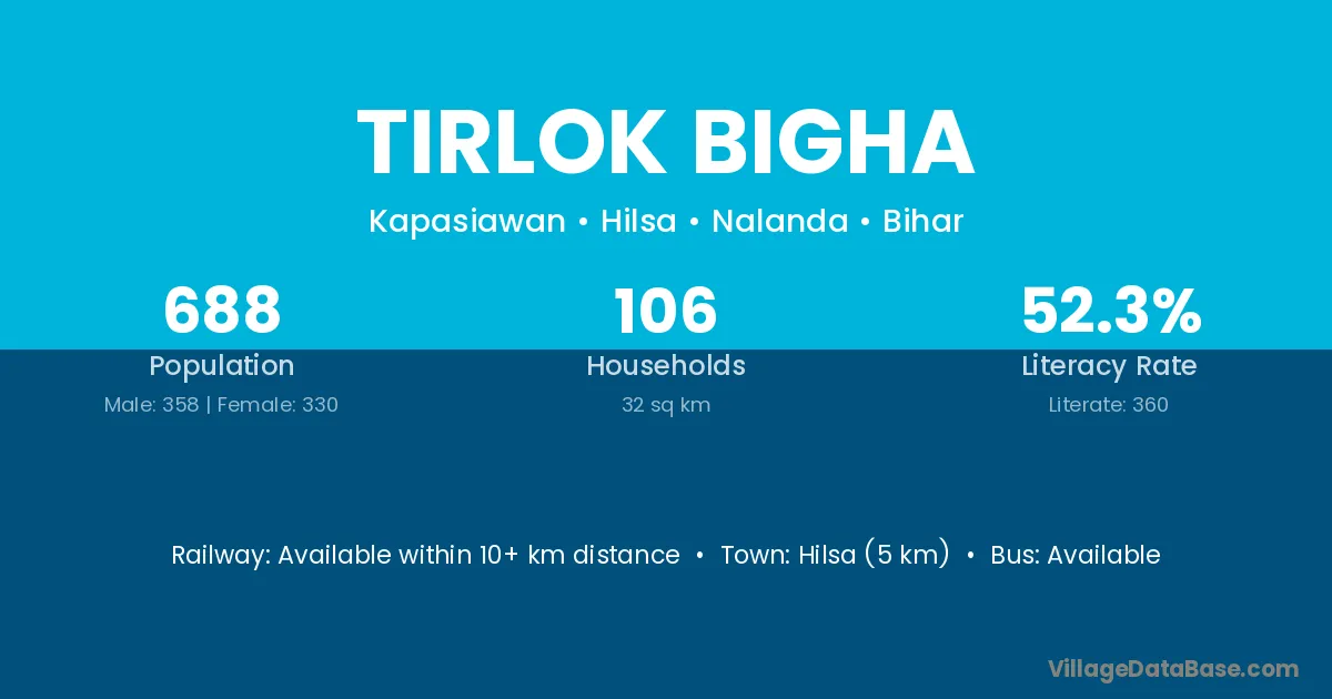 Hilsa (5 km) is the nearest town to Tirlok Bigha village for major economic activities and is located approximately 5 km away.