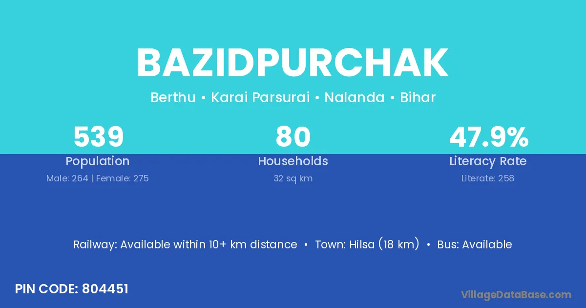 Hilsa (18 km) is the nearest town to Bazidpurchak village for major economic activities and is located approximately 18 km away.