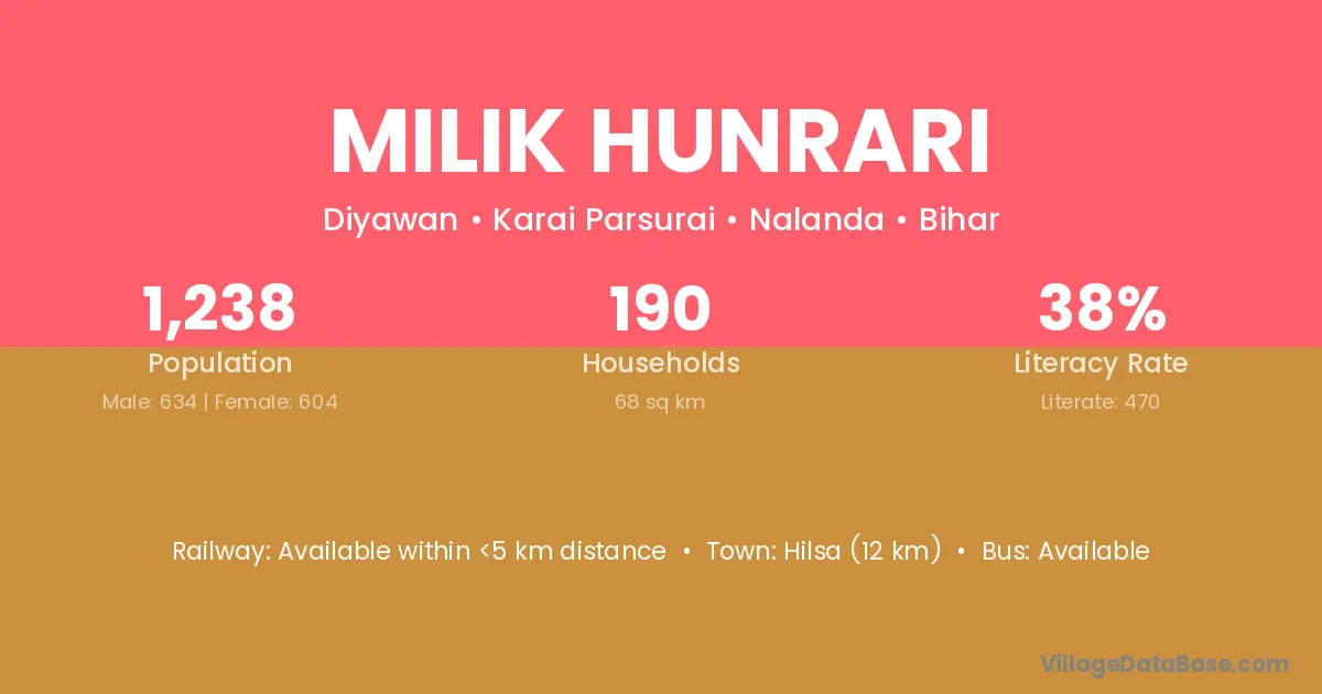 Hilsa (12 km) is the nearest town to Milik Hunrari village for major economic activities and is located approximately 12 km away.