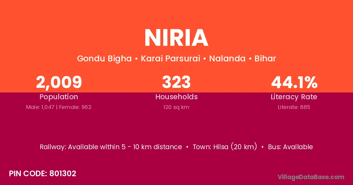 Hilsa (20 km) is the nearest town to Niria village for major economic activities and is located approximately 20 km away.