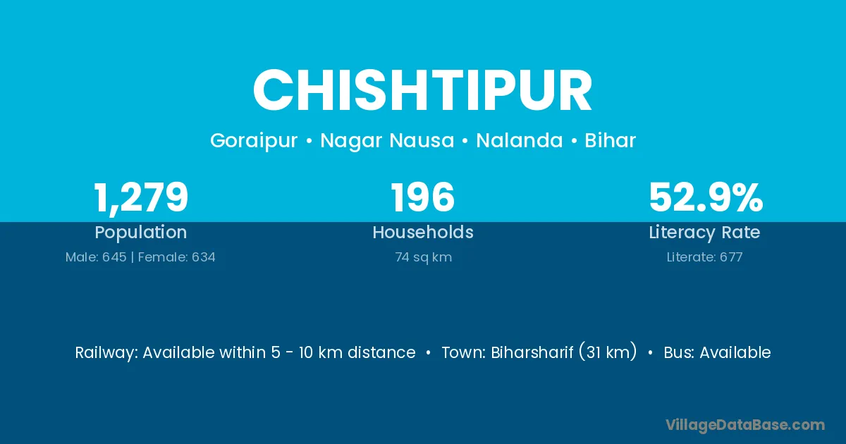 Chishtipur village has a total population of 1,279 people, of which 645 are males and 634 are females.