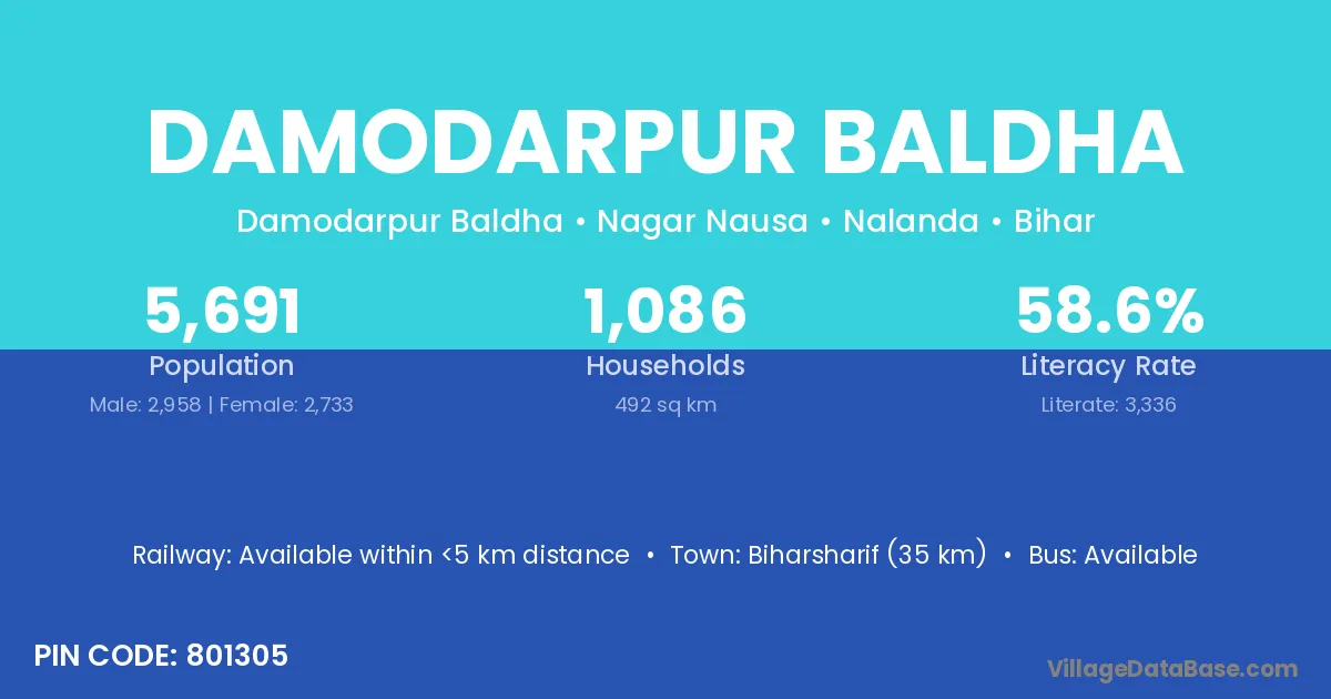 Biharsharif (35 km) is the nearest town to Damodarpur Baldha village for major economic activities and is located approximately 35 km away.