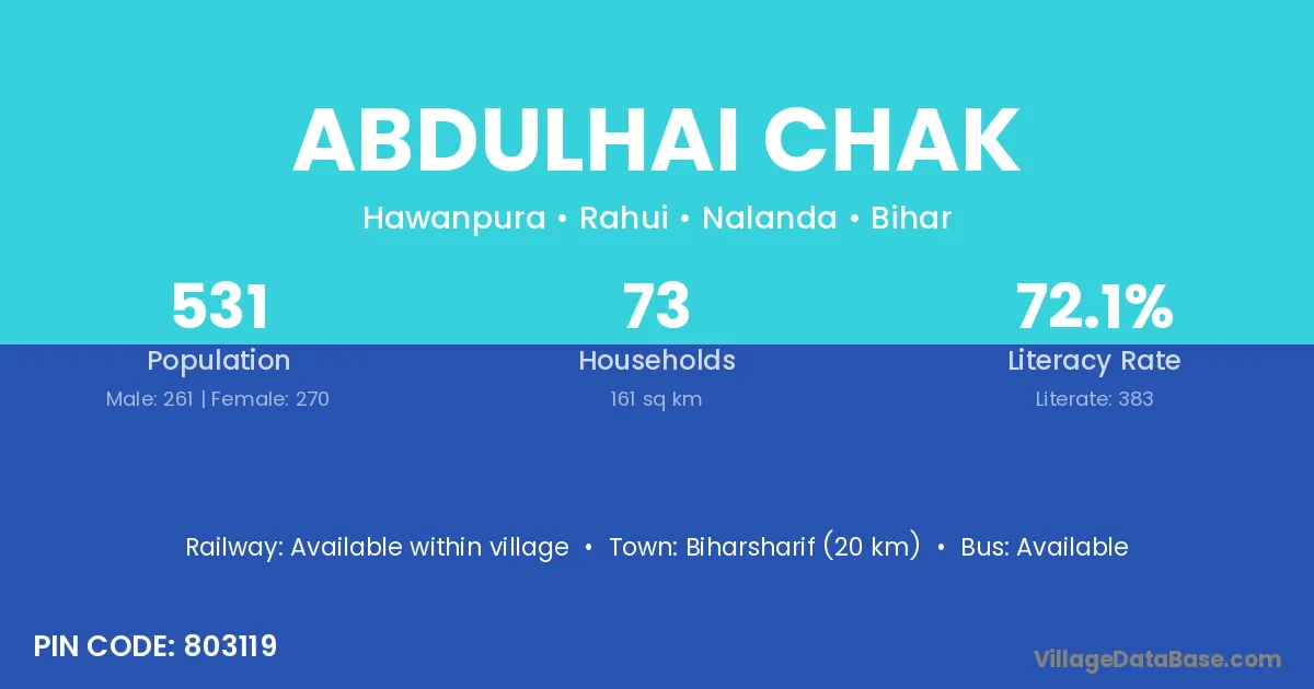 Biharsharif (20 km) is the nearest town to Abdulhai Chak village for major economic activities and is located approximately 20 km away.