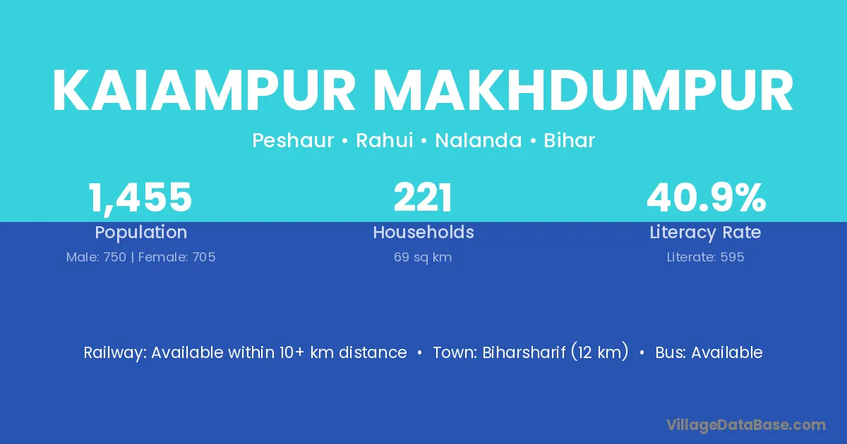 Biharsharif (12 km) is the nearest town to Kaiampur Makhdumpur village for major economic activities and is located approximately 12 km away.