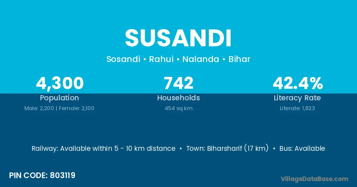 Biharsharif (17 km) is the nearest town to Susandi village for major economic activities and is located approximately 17 km away.