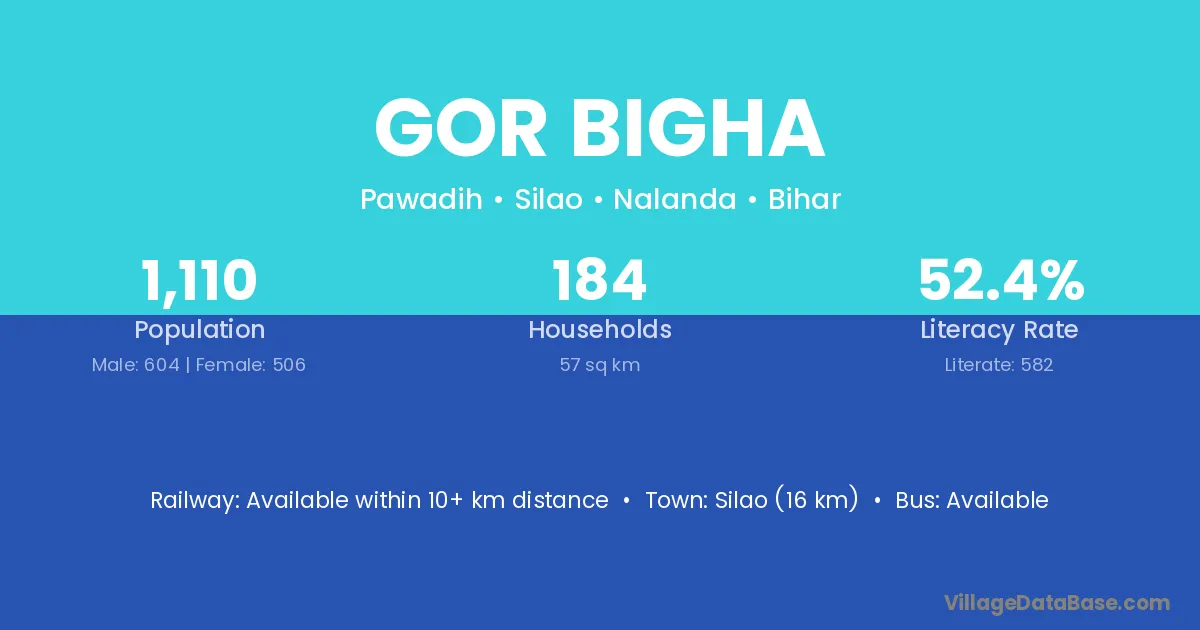 Silao (16 km) is the nearest town to Gor Bigha village for major economic activities and is located approximately 16 km away.