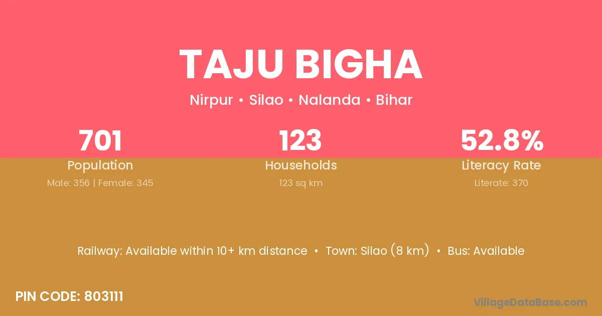 Silao (8 km) is the nearest town to Taju Bigha village for major economic activities and is located approximately 8 km away.