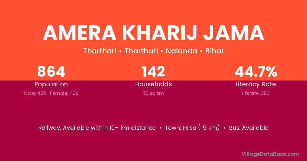 Hilsa (15 km) is the nearest town to Amera Kharij Jama village for major economic activities and is located approximately 15 km away.