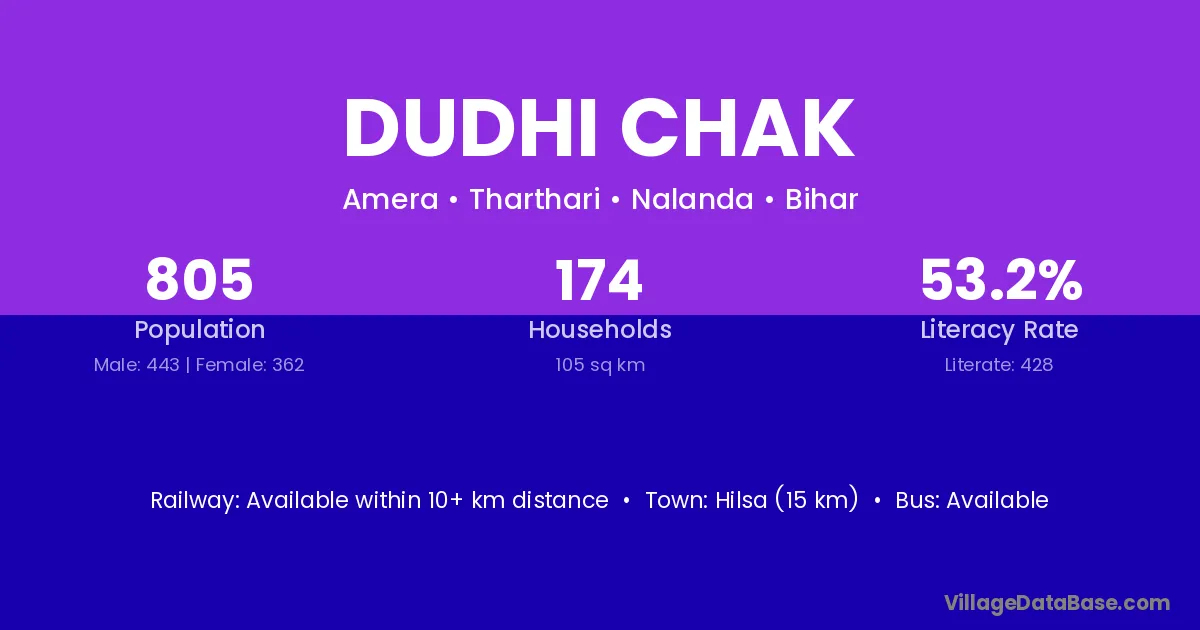 Hilsa (15 km) is the nearest town to Dudhi Chak village for major economic activities and is located approximately 15 km away.