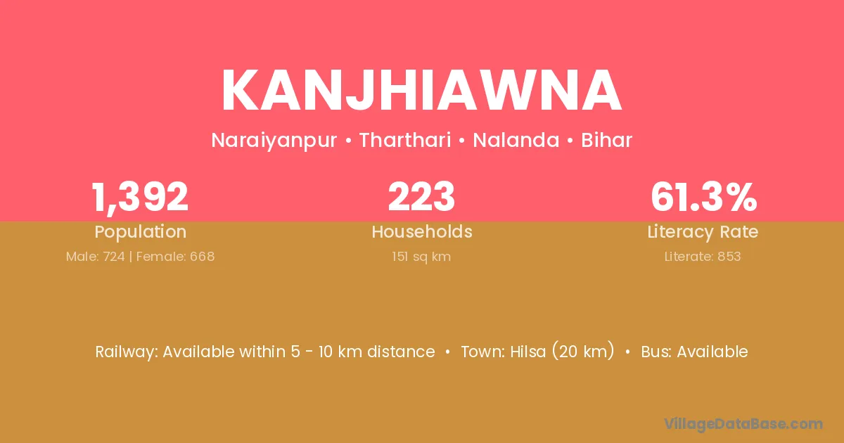 Hilsa (20 km) is the nearest town to Kanjhiawna village for major economic activities and is located approximately 20 km away.