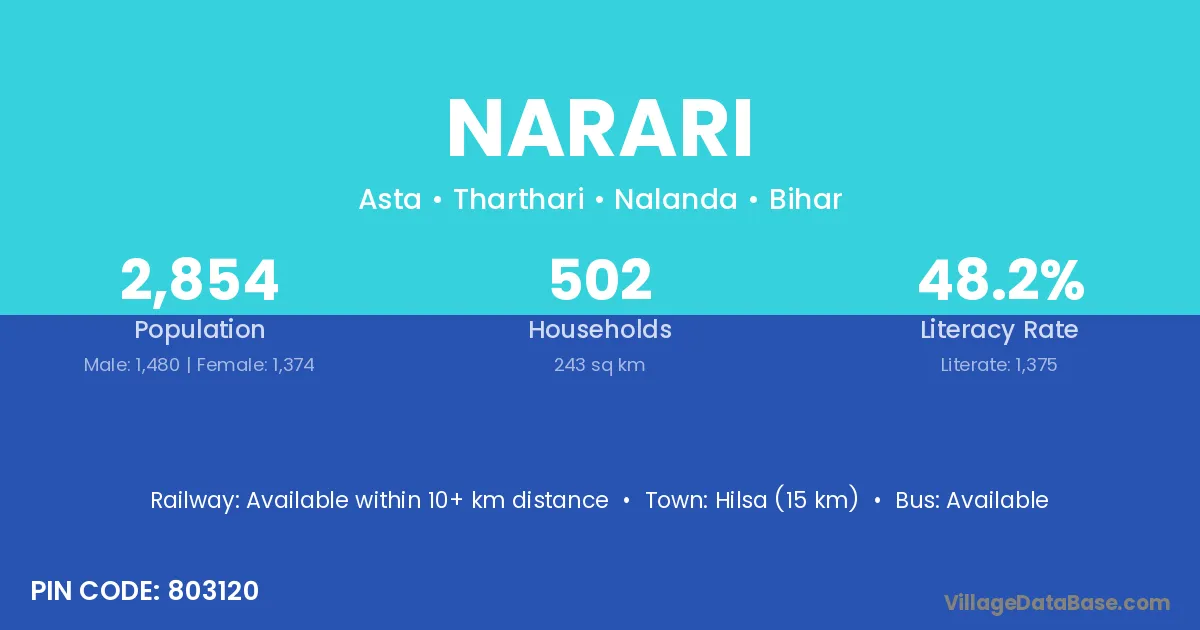 Hilsa (15 km) is the nearest town to Narari village for major economic activities and is located approximately 15 km away.