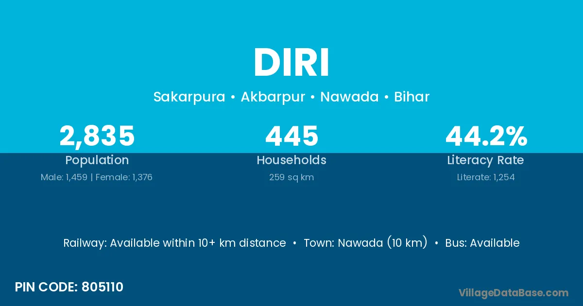 Nawada (10 km) is the nearest town to Diri village for major economic activities and is located approximately 10 km away.