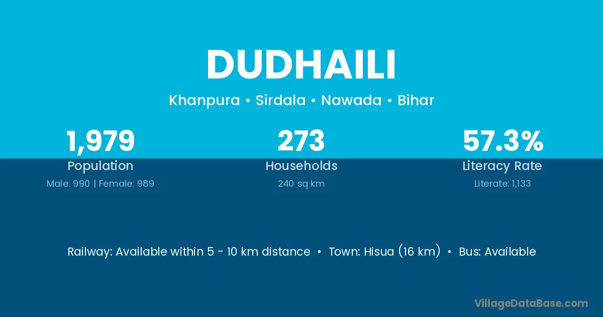 Nawada (6 km) is the nearest town to Dudhaili village for major economic activities and is located approximately 6 km away.