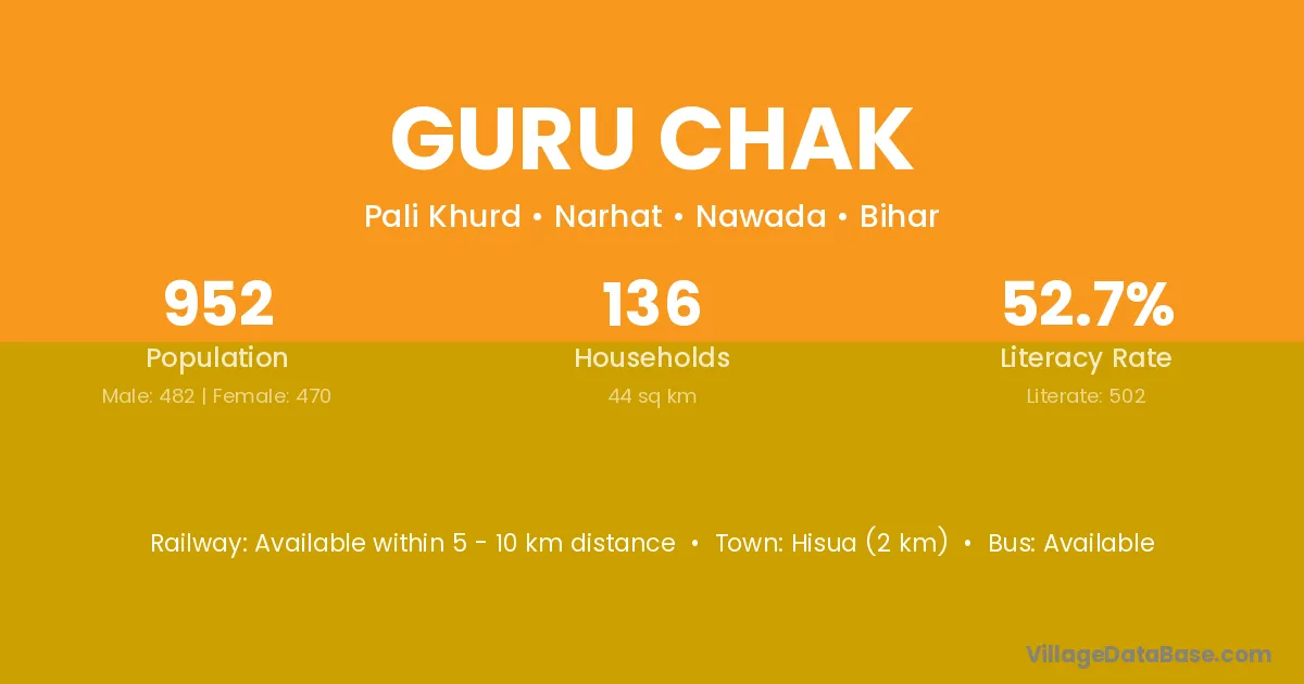 Nawada (16 km) is the nearest town to Guru Chak village for major economic activities and is located approximately 16 km away.