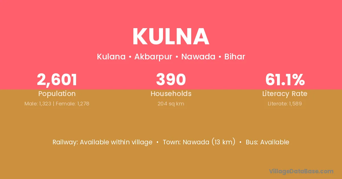 Nawada (13 km) is the nearest town to Kulna village for major economic activities and is located approximately 13 km away.