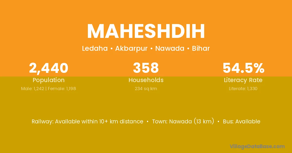 Nawada (13 km) is the nearest town to Maheshdih village for major economic activities and is located approximately 13 km away.