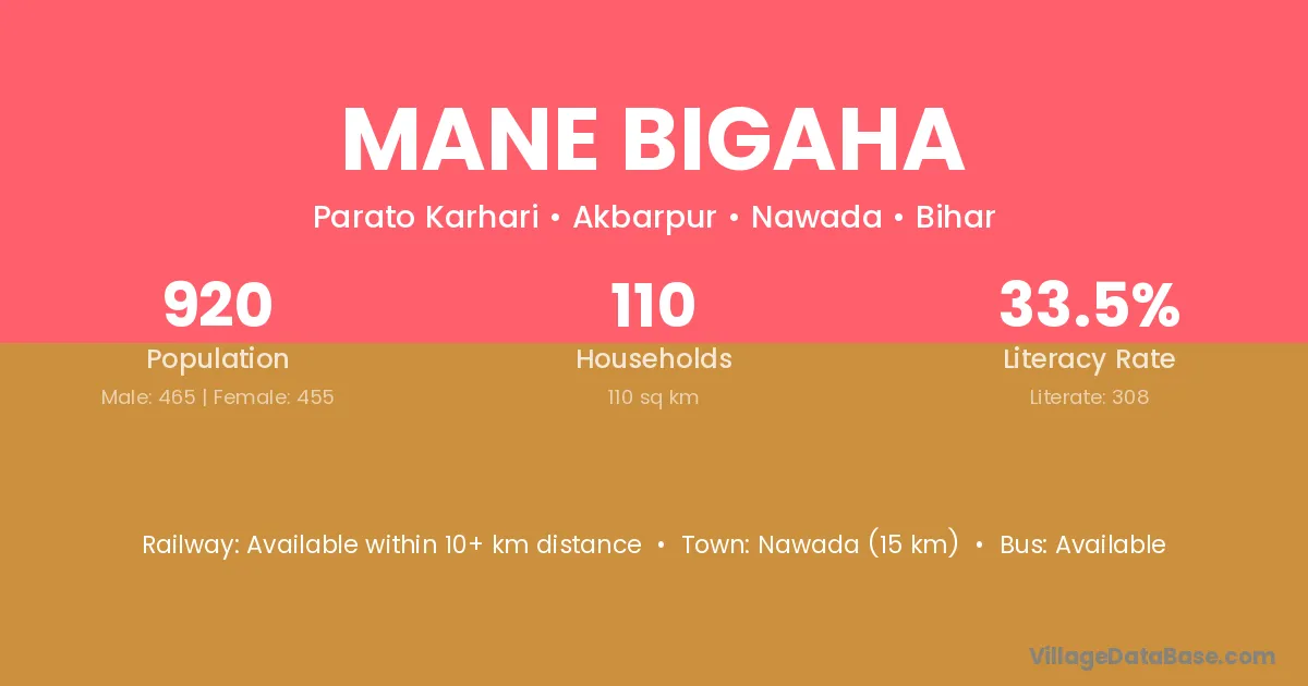 Nawada (15 km) is the nearest town to Mane Bigaha village for major economic activities and is located approximately 15 km away.