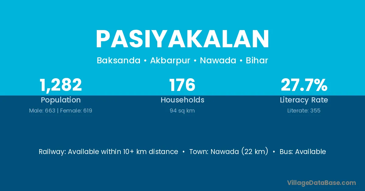 Nawada (22 km) is the nearest town to Pasiyakalan village for major economic activities and is located approximately 22 km away.