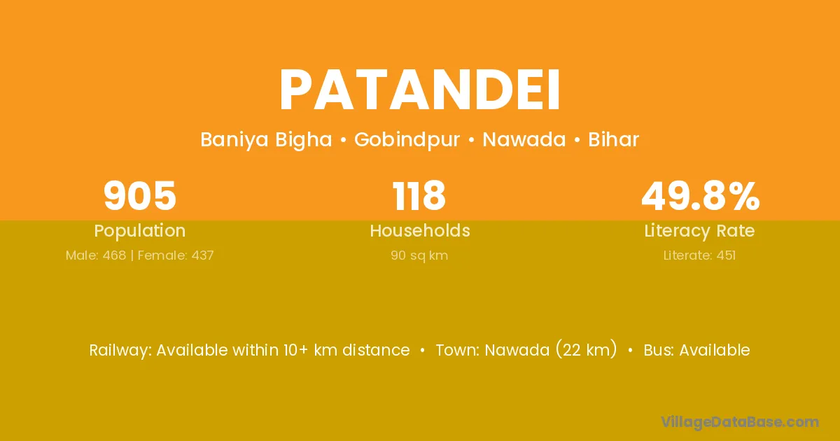 Nawada (22 km) is the nearest town to Patandei village for major economic activities and is located approximately 22 km away.