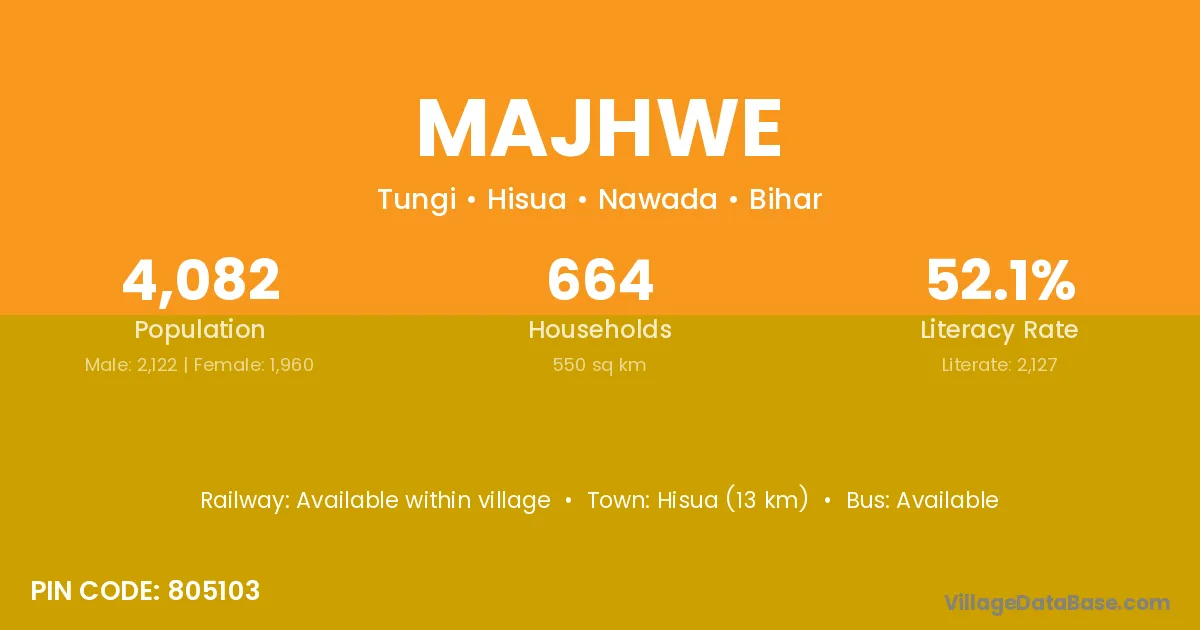 Hisua (13 km) is the nearest town to Majhwe village for major economic activities and is located approximately 13 km away.