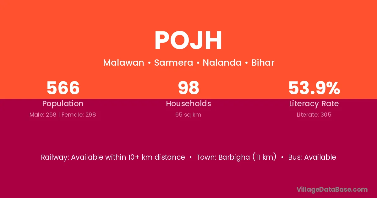 Warisaliganj (12 km) is the nearest town to Pojh village for major economic activities and is located approximately 12 km away.