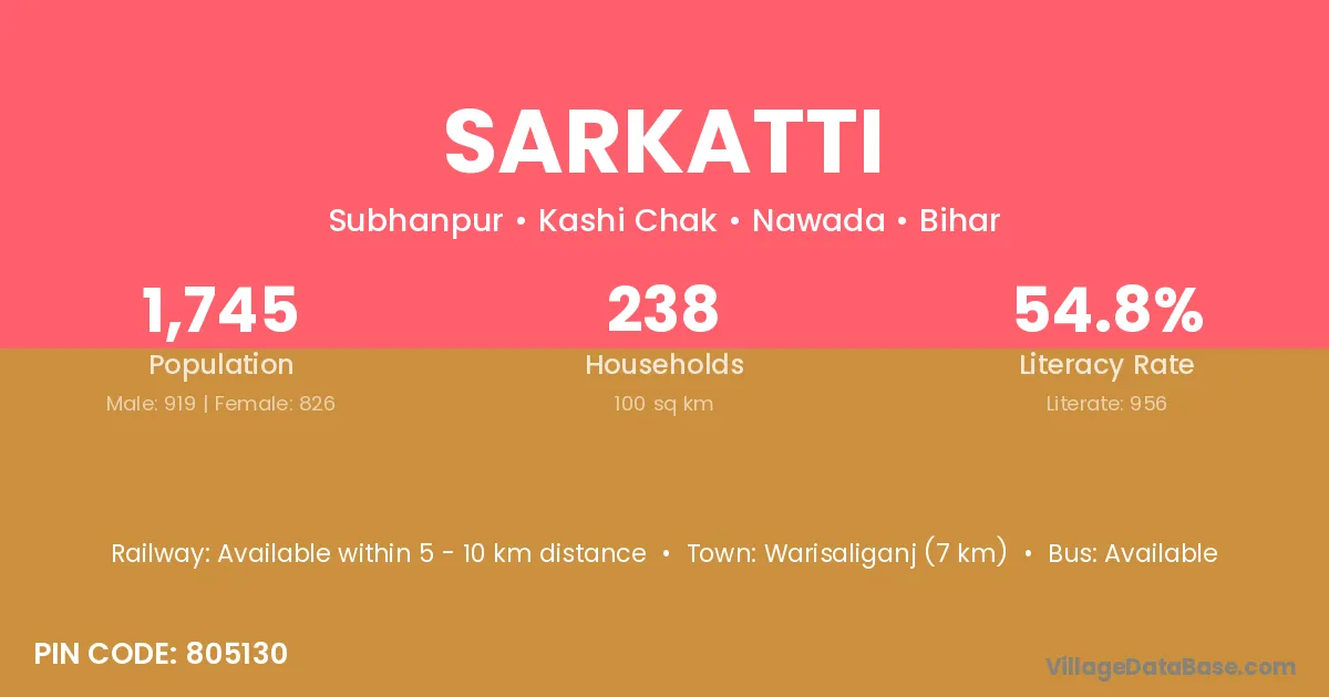 Warisaliganj (7 km) is the nearest town to Sarkatti village for major economic activities and is located approximately 7 km away.