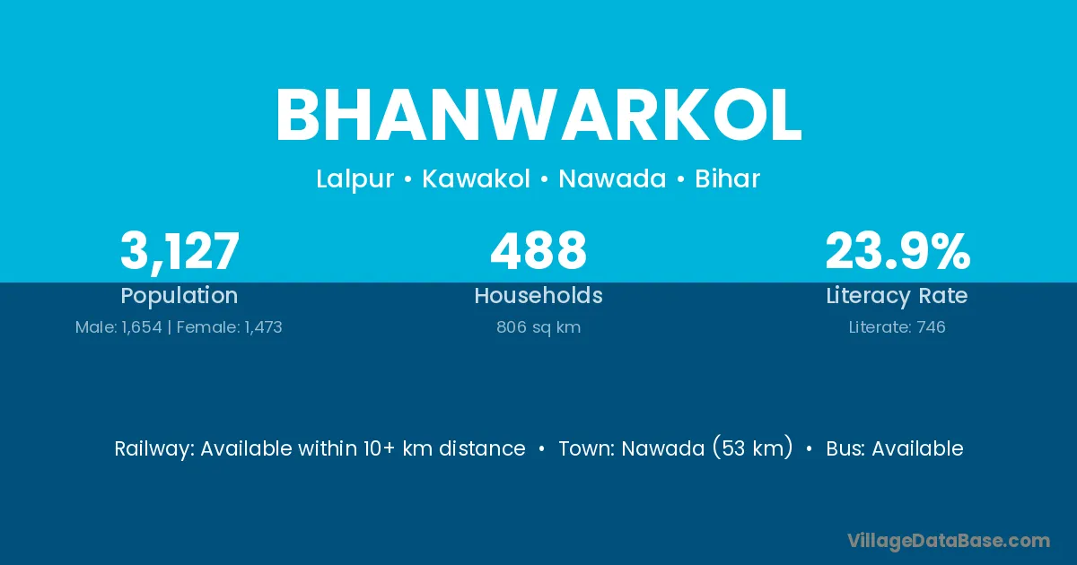 Nawada (53 km) is the nearest town to Bhanwarkol village for major economic activities and is located approximately 53 km away.