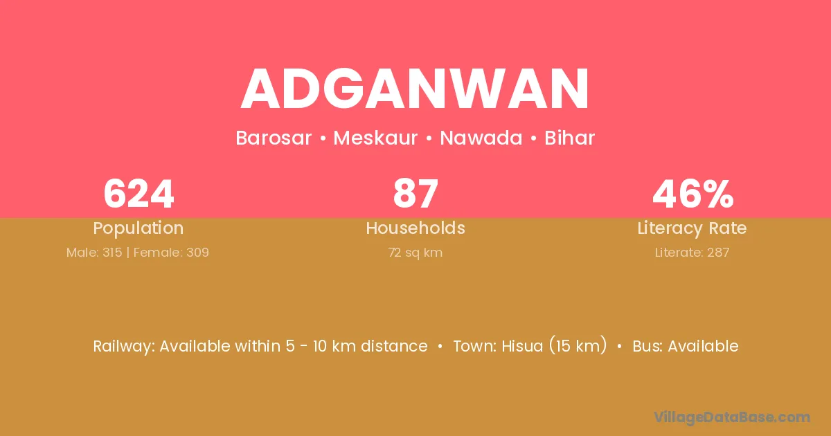 Hisua (15 km) is the nearest town to Adganwan village for major economic activities and is located approximately 15 km away.