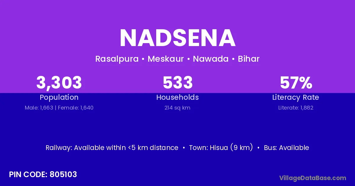 Nadsena village has a total population of 3,303 people, of which 1,663 are males and 1,640 are females.