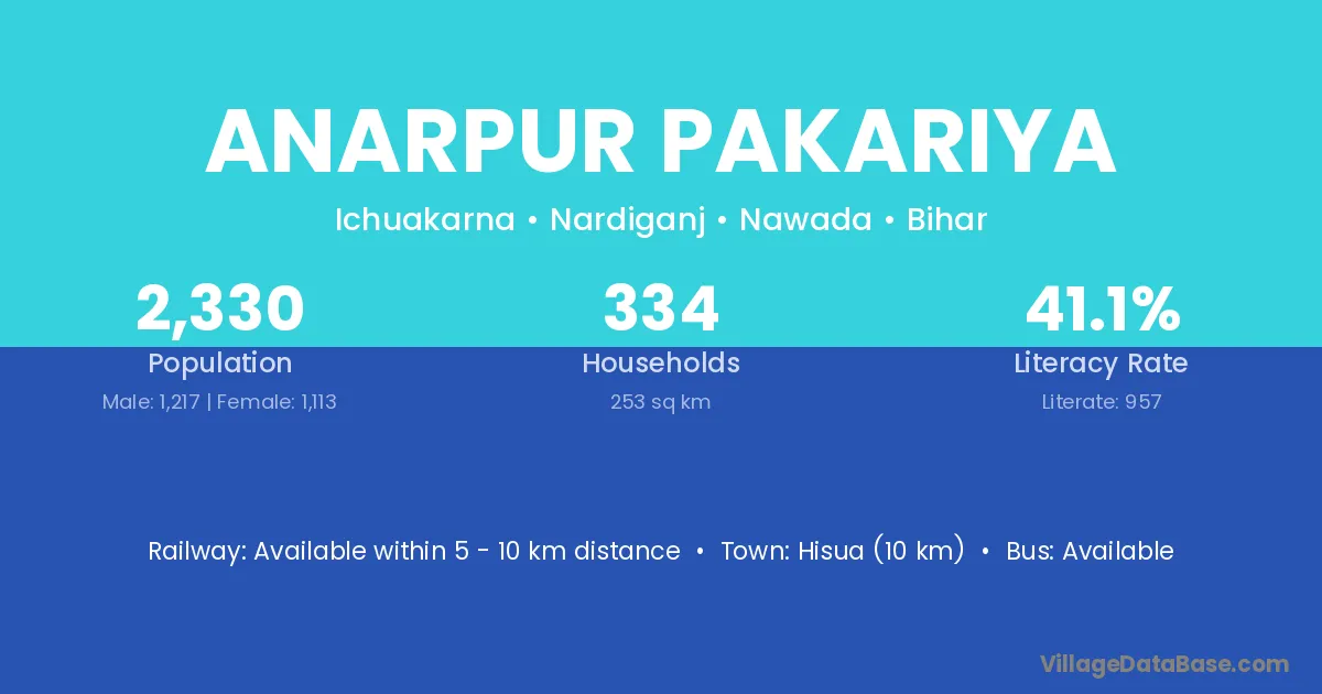 Hisua (10 km) is the nearest town to Anarpur Pakariya village for major economic activities and is located approximately 10 km away.