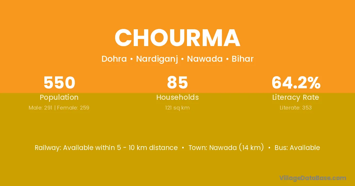 Nawada (14 km) is the nearest town to Chourma village for major economic activities and is located approximately 14 km away.