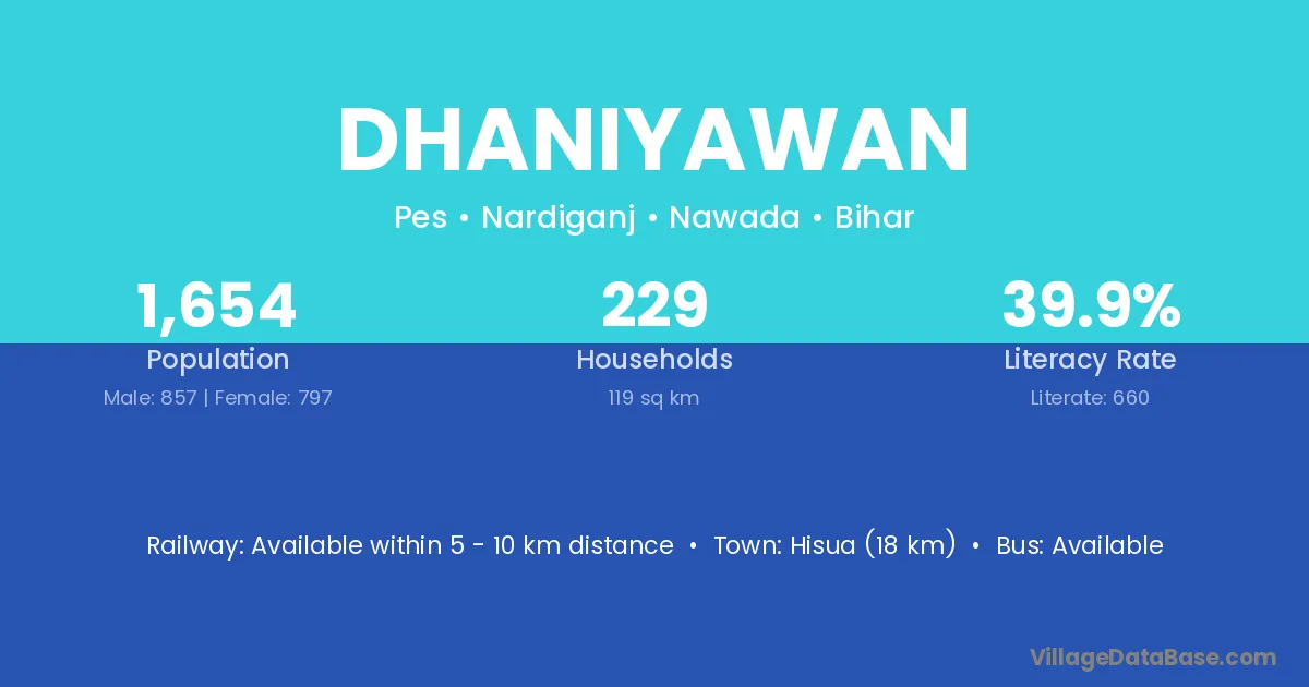 Hisua (18 km) is the nearest town to Dhaniyawan village for major economic activities and is located approximately 18 km away.