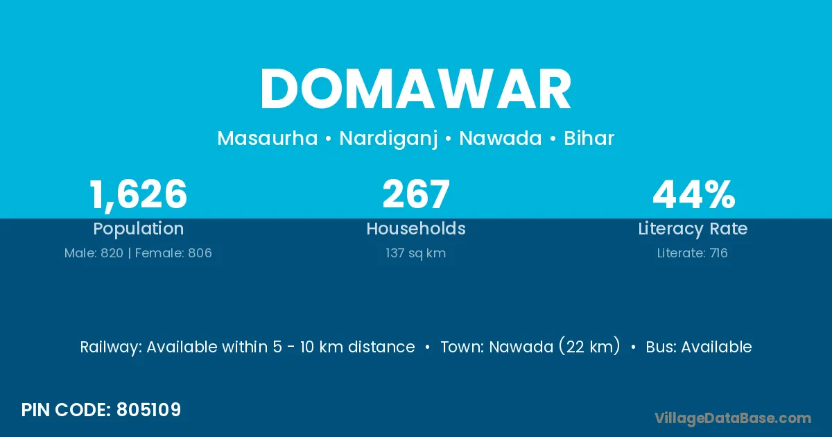 Nawada (22 km) is the nearest town to Domawar village for major economic activities and is located approximately 22 km away.