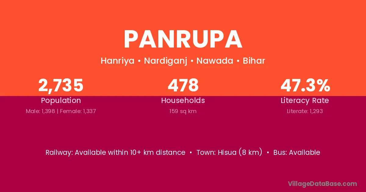 Hisua (8 km) is the nearest town to Panrupa village for major economic activities and is located approximately 8 km away.