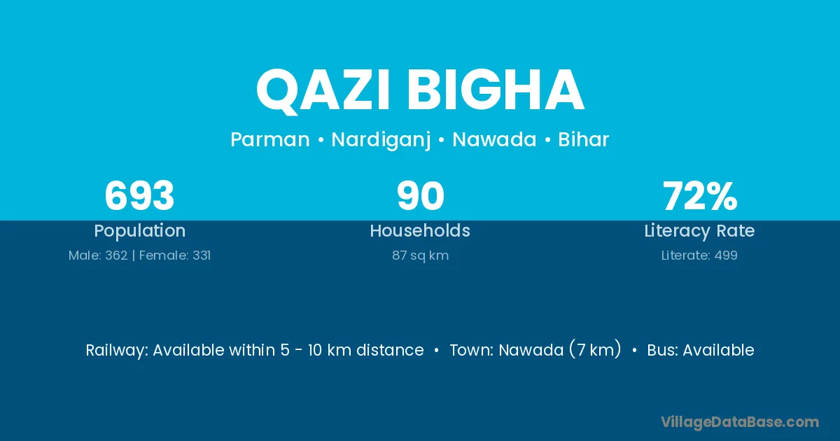 Nawada (7 km) is the nearest town to Qazi Bigha village for major economic activities and is located approximately 7 km away.