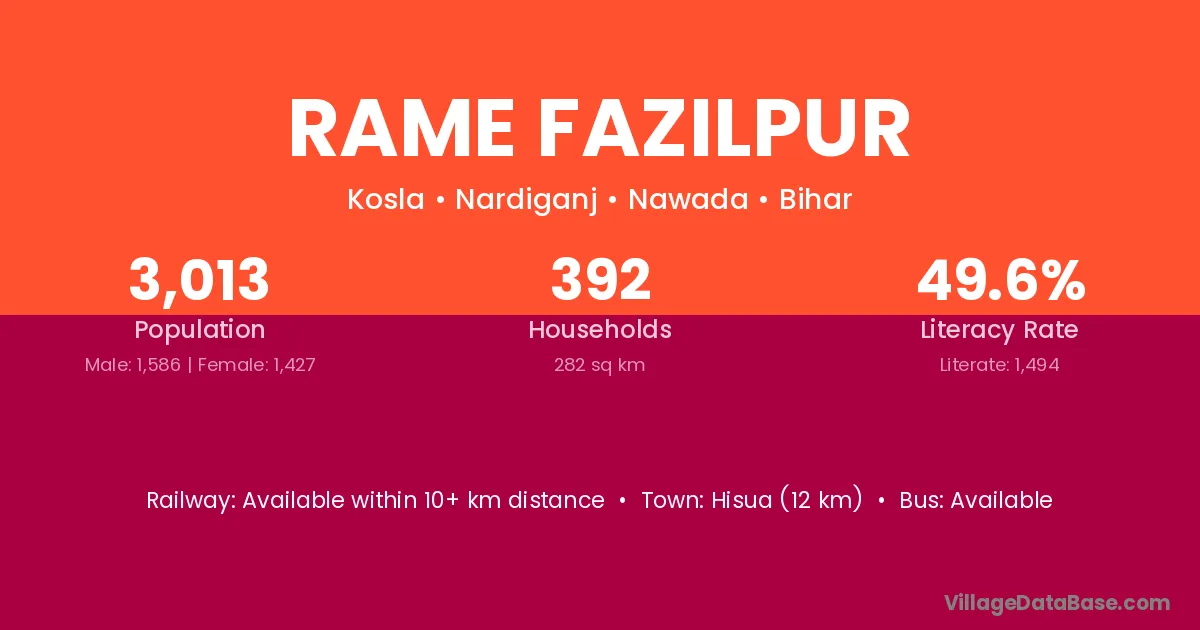 Hisua (12 km) is the nearest town to Rame Fazilpur village for major economic activities and is located approximately 12 km away.