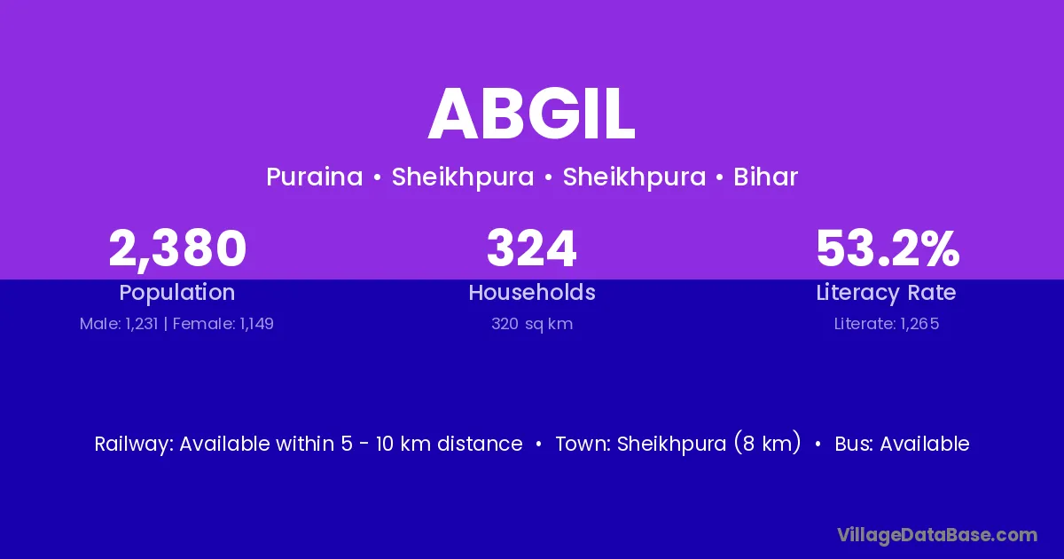 The literacy rate of Abgil village is 48.18%. Male literacy stands at 55.32% and female literacy at 41.94%.
