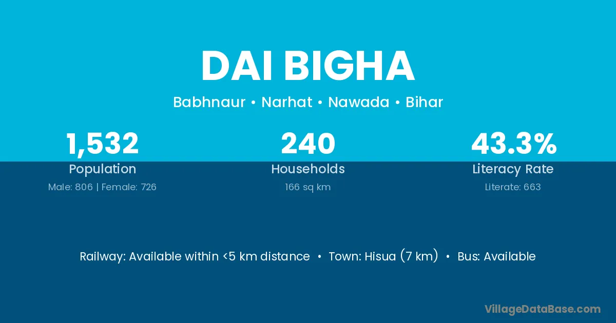 Hisua (7 km) is the nearest town to Dai Bigha village for major economic activities and is located approximately 7 km away.