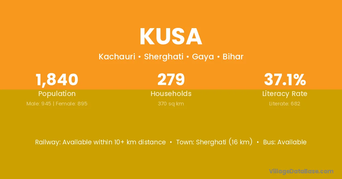 The literacy rate of Kusa village is 50.13%. Male literacy stands at 57.12% and female literacy at 43.22%.