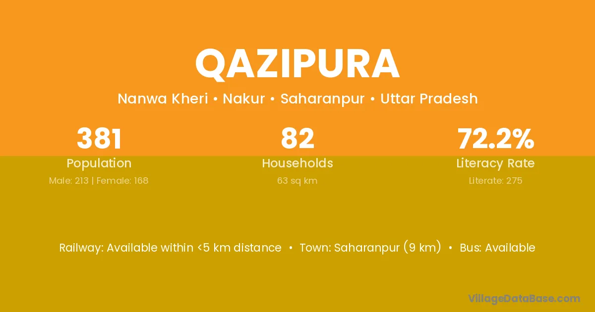 The literacy rate of Qazipura village is 71.87%. Male literacy stands at 78.21% and female literacy at 64.86%.